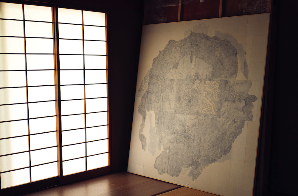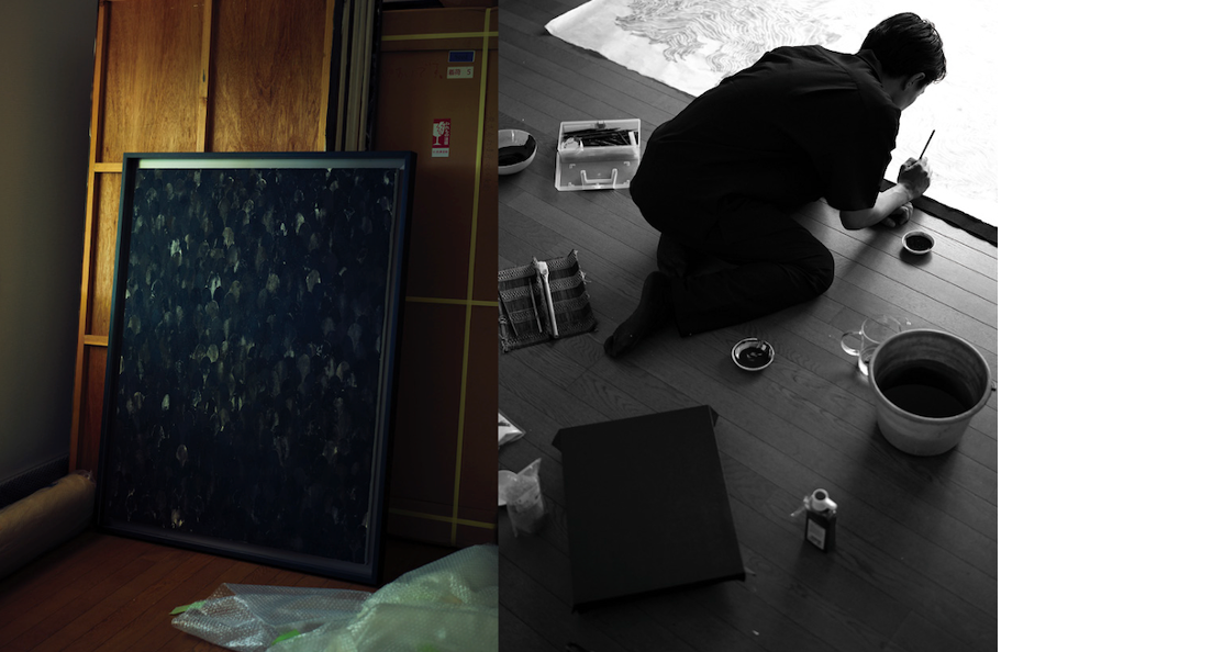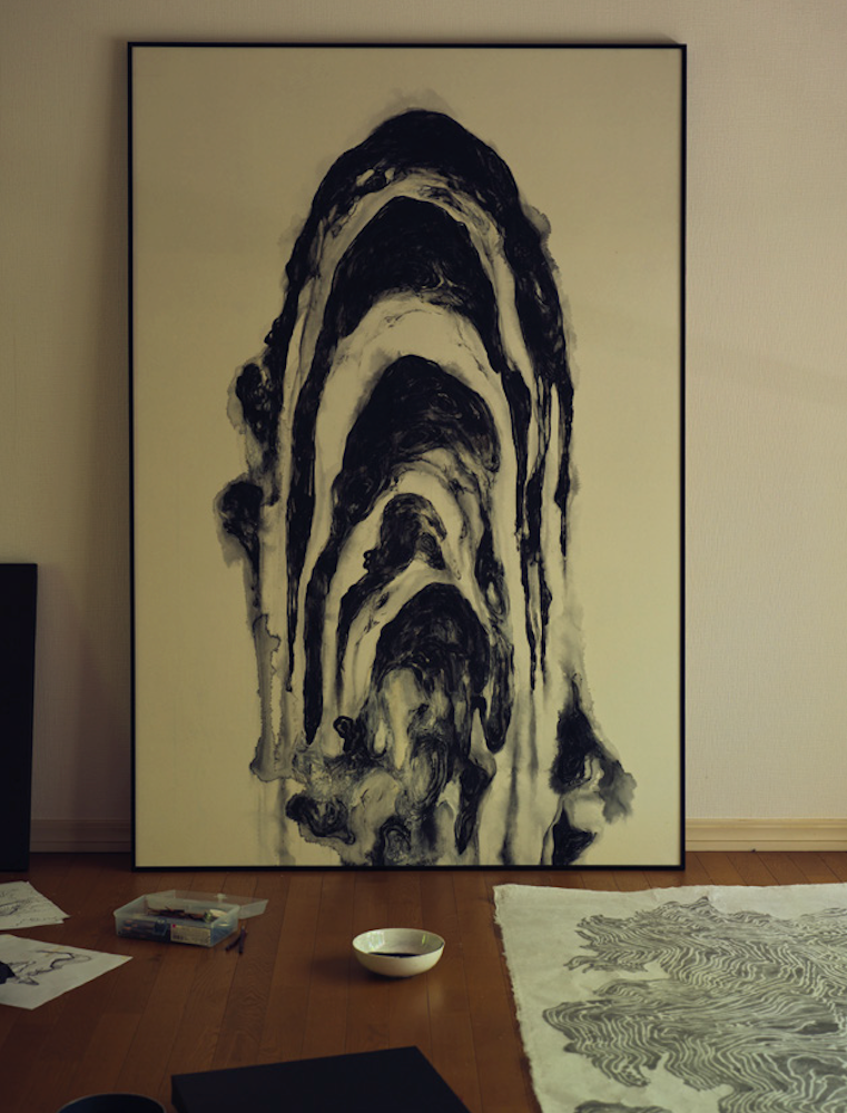 “I started creating black-and-white works about four or five years ago. I’m aware that I have little sense of color, so I don’t see the point in trying to overcome that. Besides, with Japanese painting materials, there are several types of black ink, and the tone of black mineral pigments varies according to the coarseness of the particles. I find these variations deeply compelling, which is why I decided to paint in monochrome.”