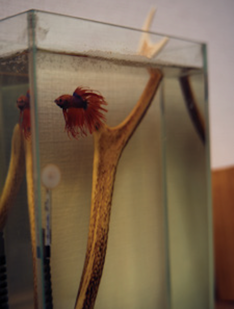 I start by feeding my beta fish, a type of aquarium fish.