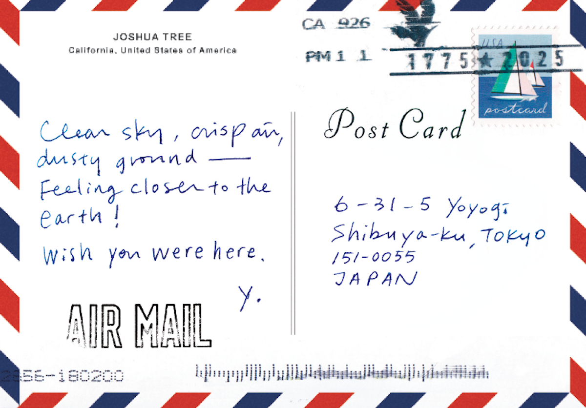 〈カンノーロ〉を連れてカリフォルニアの旅へ。砂漠の岩肌が陽に照らされ、乾いた風が吹き抜ける。そして、波音が聞こえてくるような海岸線。“Clean sky, crisp air, dusty ground — feeling closer to the earth! Wish you were here.” 本人直筆のメッセージとともに届いたのは、まるでポストカードのように美しい風景写真。その雄大な自然の中で、ひときわ鮮やかな赤の〈カンノーロ〉が印象的。澄みわたる空気や陽射しの温度、風と大地の呼吸までも感じられる作品は、旅の記憶としてだけでなく、日常と非日常が静かに交錯する物語を感じさせる。