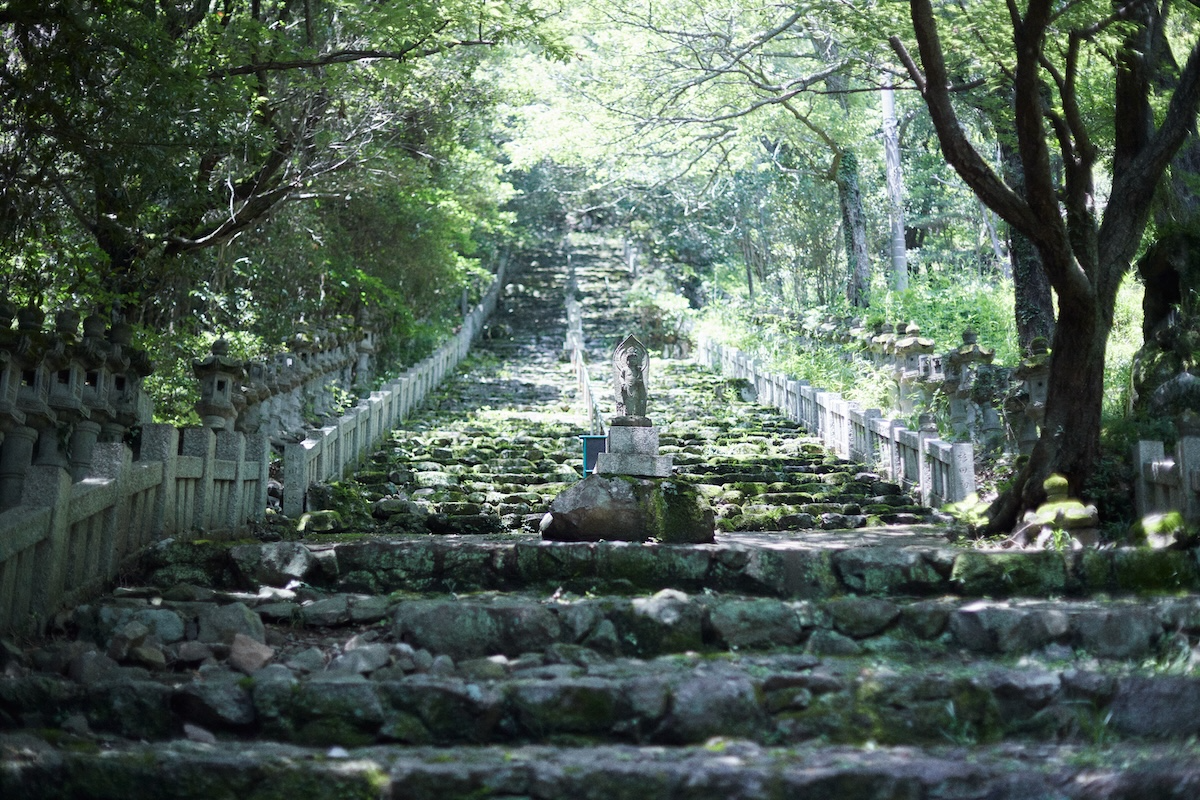 Widely considered the most challenging site among the Shodoshima 88 Sacred Pilgrimage, No. 72 Ryoukouji Temple and its inner sanctuary, Okunoin Kasagataki, test both body and spirit. Reaching the main hall requires overcoming three successive obstacles: a long flight of steps, the first cliff, and the second cliff.